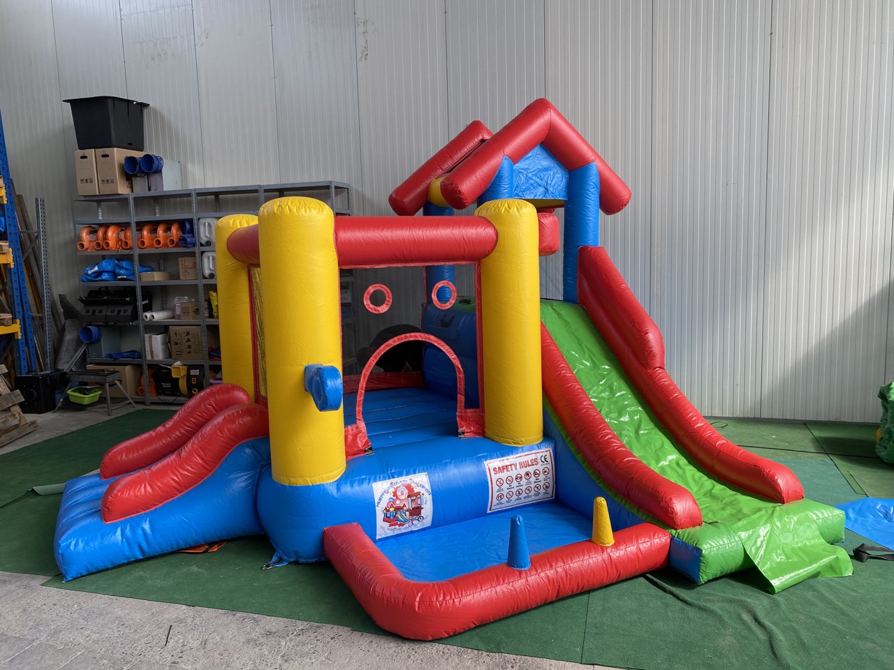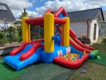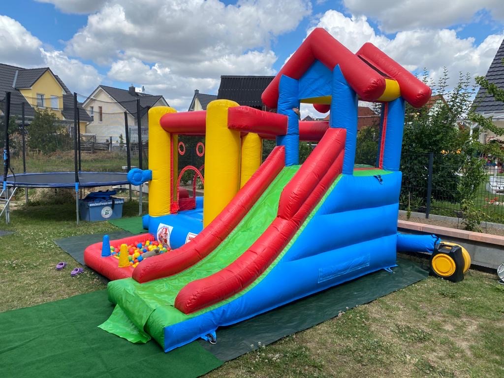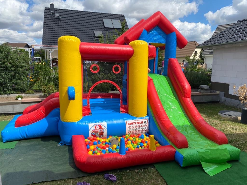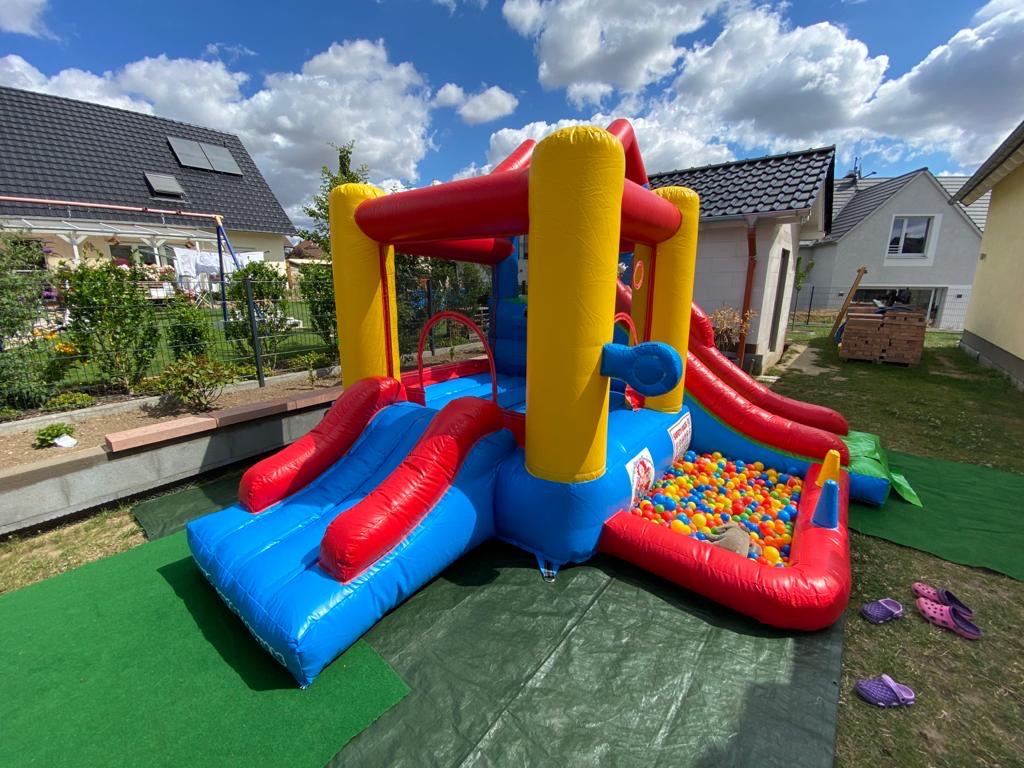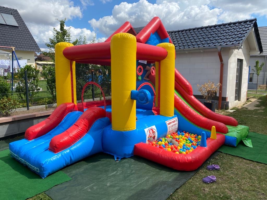 Die Hüpfburg „PLAYCENTER 7 IN 1“ ist der perfekte Spielplatz für alle Abenteuerlustigen! Auf einer großzügigen Grundfläche von 16 m² bietet diese Multifunktions-Hüpfburg gleich sieben spannende Spielmöglichkeiten, die keine Langeweile aufkommen lassen. Die Kinder können sich beim Hüpfen, Rutschen, Klettern, Boxen und Dartspielen so richtig austoben. Besonders beliebt ist das Bällebad, in dem die Kleinen plantschen können, sowie die Ringe, die geworfen werden können – hier ist für jeden etwas dabei!